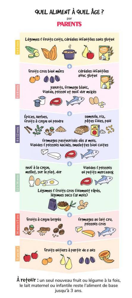 Retrouvez l'infographie réalisée par le site Parents pour connaître quand intégrer les différents aliments.